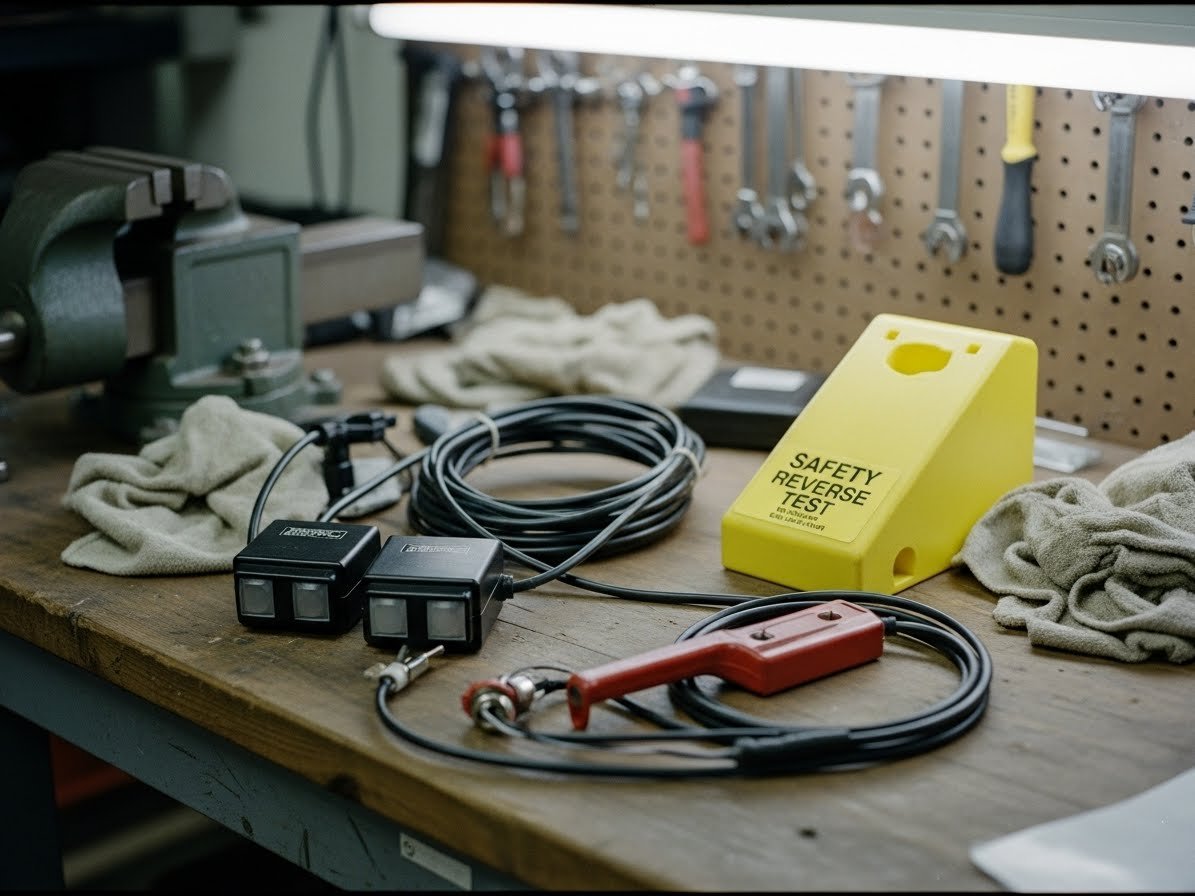 A fail looks like: the door keeps closing, hesitates, or only reverses after it has traveled too far. If it fails, clean the lenses first and check that both sensors point straight at each other. If the indicator lights on the sensors are blinking or off, that’s another clue.